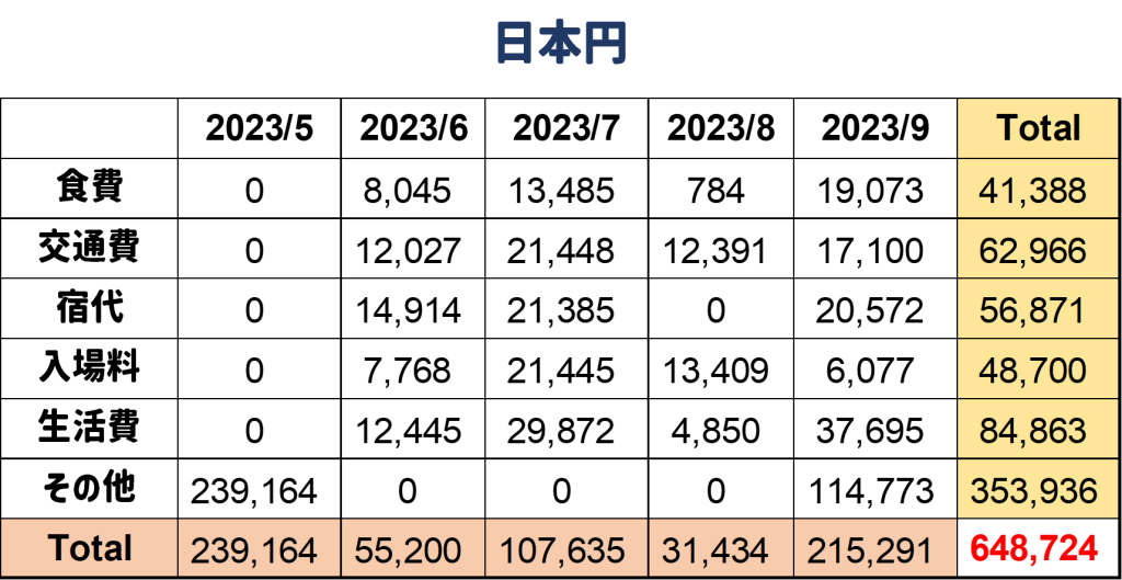 5月の「その他」は、VISA申請、健康保険、あと行きのチケット代です。そして9月の「その他」は帰りのチケット代です。65万元の中に26万円くらいは飛行機代でした。