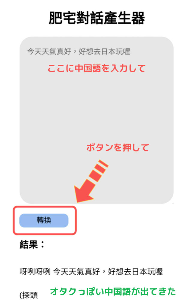 転換ボタンを押すと毎回出てきたオタク用語は変わりますよ~。